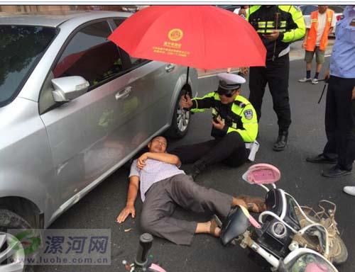 6月30日,烈日下、酷暑難耐,馬路上,車流如織。正在此時,一位騎車老人被車撞倒后蜷縮在地?zé)o法起身。緊急時刻,執(zhí)勤交警迅速趕來,一邊為老人撐傘遮擋烈日,一邊將老人的頭部枕在自己腿部,等待救護車到來。