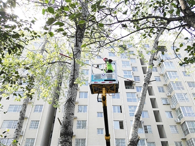 園林工人們正在修剪楊樹(shù)枝,以此來(lái)減少楊花的成孢率,減少飛絮。