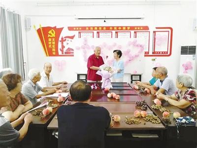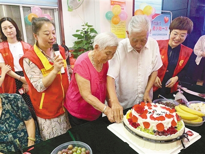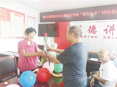 8月6日,源匯區(qū)受降路社區(qū)9對金婚夫妻齊聚一堂,互訴衷腸,用鮮花、蛋糕慶祝“七夕”。記者 于文博 攝