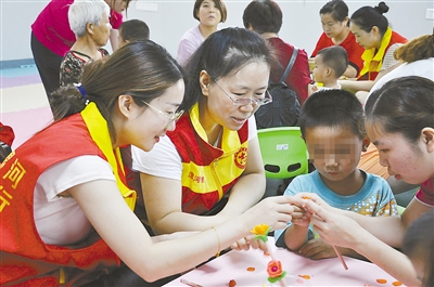8月7日,市殘聯(lián)組織志愿者到市第六人民醫(yī)院開展志愿服務(wù)活動,與孤獨癥殘疾兒童共同慶祝“七夕”。圖為志愿者手把手教孩子們用橡皮泥制作花朵。 記者 王艷彬 攝