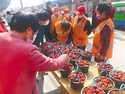 (記者 朱 紅 見習(xí)記者 黨夢琦)“新鮮的草莓,每位環(huán)衛(wèi)工可以免費領(lǐng)一籃。”4月15日,在市區(qū)緯一路愛心粥屋門前,負責(zé)人高紅熱情地招呼著前來領(lǐng)取草莓的環(huán)衛(wèi)工。