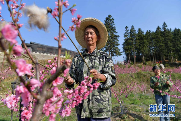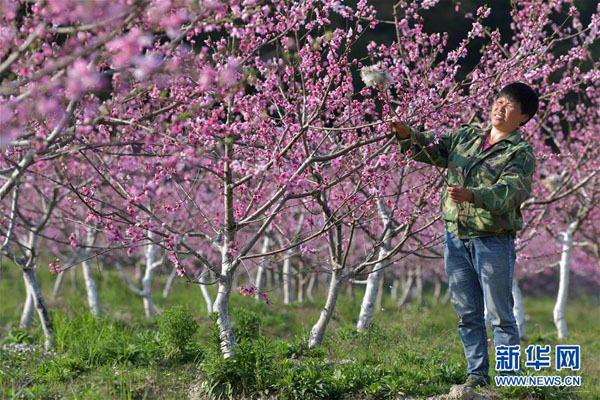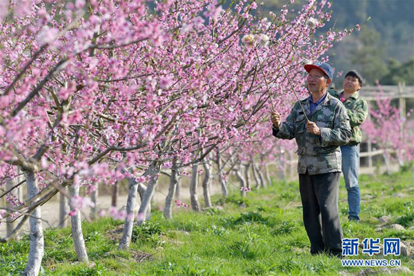 在南昌市灣里區(qū)太平鎮(zhèn),農(nóng)民在桃園基地內(nèi)對桃樹進行人工授粉(3月19日攝)。新華社記者 彭昭之 攝