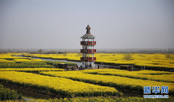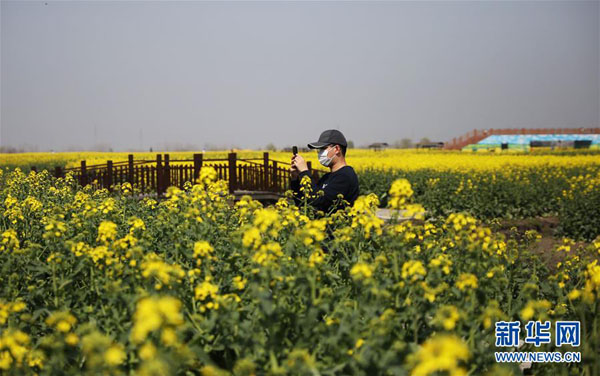 3月18日,游客在江蘇省興化市千垛景區(qū)拍照。 近日,正值江蘇省興化市千垛景區(qū)萬(wàn)畝油菜花盛開(kāi)期,金燦燦的油菜花在水道圍成的垛田上形成一片片金黃色的“花海”,形成了“河有萬(wàn)灣多碧水,田無(wú)一垛不黃花”的壯觀景色。 新華社記者 李雨澤攝