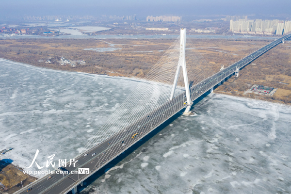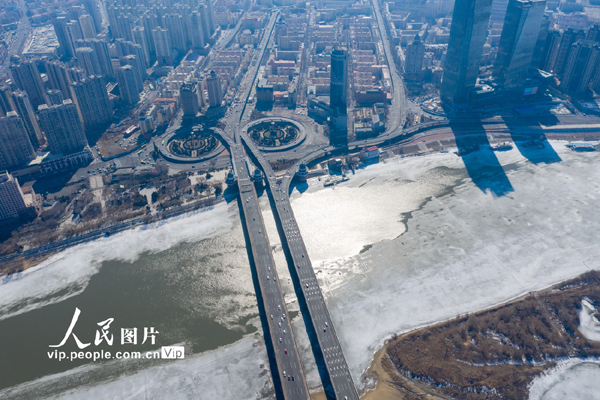 2020年3月22日,松花江哈爾濱段江面隨著氣溫升高正逐漸融化,形成“半江春水,半江寒冰”的自然現(xiàn)象。王昭博/人民圖片