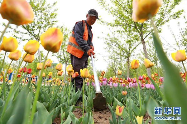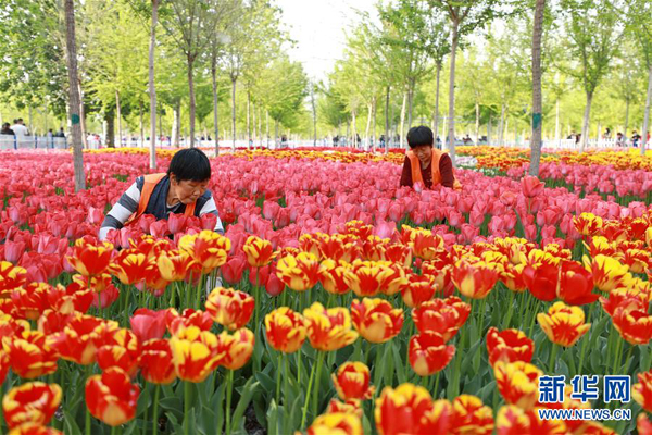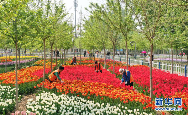 4月19日,工人在河北省辛集市區(qū)打理鮮花。 近日,河北省辛集市在城市道路兩側(cè)和公園內(nèi)栽植的上萬株郁金香競(jìng)相綻放,繽紛的鮮花成為城市一道亮麗的風(fēng)景線。 新華社記者 牟宇 攝
