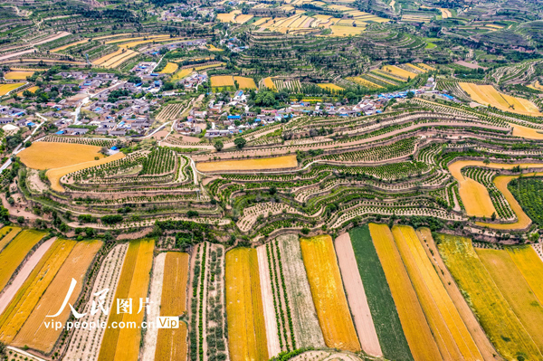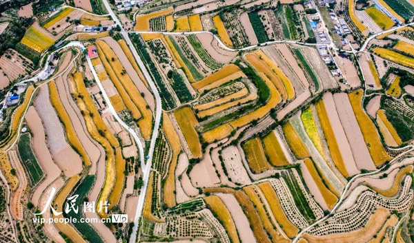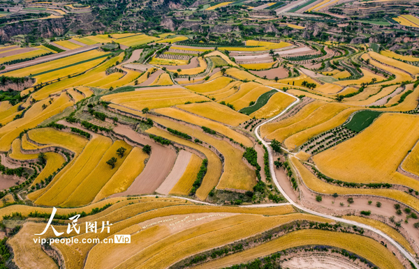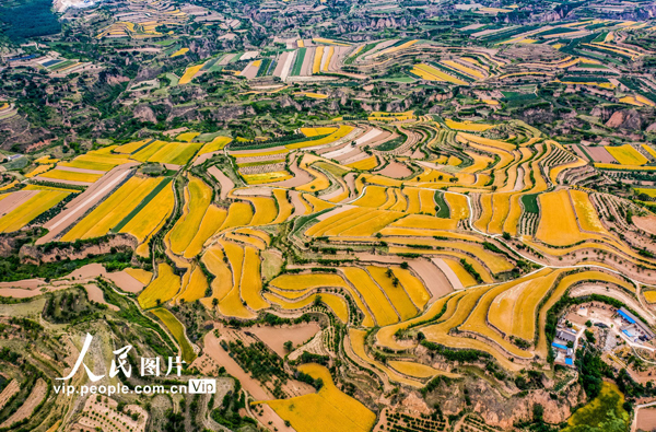 眼下正值小麥成熟收獲時(shí)節(jié),山西省運(yùn)城市萬榮縣漢薛鎮(zhèn),金色的小麥分布在層層的梯田上,從空中俯瞰,宛如一幅金色的田園畫卷,美不勝數(shù)。薛俊/人民圖片