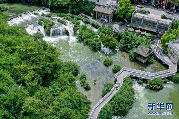 6月9日,游人在貴陽市天河潭旅游度假區(qū)游玩。 夏日的貴陽市天河潭旅游度假區(qū)草木蒼翠,風(fēng)景如畫,吸引游客來此休閑游玩。 新華社記者 歐東衢 攝
