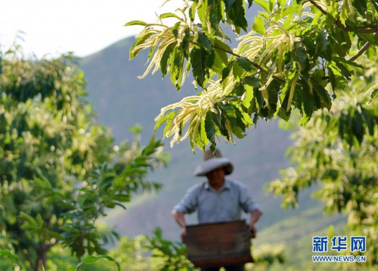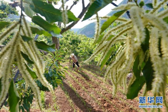 6月10日,河北省遷安市大五里鄉(xiāng)農(nóng)民在板栗林中打理套種的農(nóng)作物。 近日,河北省遷安市栗花進入盛花期。遷安市板栗栽培歷史悠久,現(xiàn)有種植面積11萬畝,是帶動當?shù)剞r(nóng)民增收的特色產(chǎn)業(yè)。 新華社記者 牟宇 攝