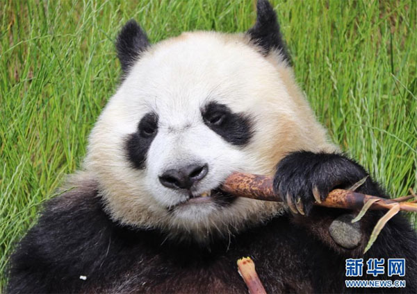 在位于四川省阿壩藏族羌族自治州的九寨溝大熊貓園拍攝的大熊貓(6月19日攝)。 近日,位于四川九寨溝縣勿角大熊貓自然保護(hù)區(qū)內(nèi)的九寨溝大熊貓園開(kāi)園迎客,從中國(guó)大熊貓保護(hù)研究中心遷入的4只大熊貓“小禮物”“海海”“天天”“新新”正式與公眾見(jiàn)面。全國(guó)第四次大熊貓調(diào)查報(bào)告顯示,九寨溝縣有野生大熊貓31只,其中勿角大熊貓自然保護(hù)區(qū)內(nèi)有22只。 新華社記者 劉坤 攝
