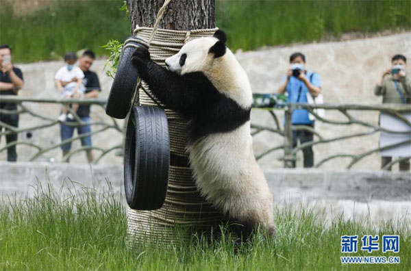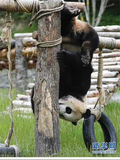 在位于四川省阿壩藏族羌族自治州的九寨溝大熊貓園,大熊貓“新新”在玩耍(6月19日攝)。 近日,位于四川九寨溝縣勿角大熊貓自然保護(hù)區(qū)內(nèi)的九寨溝大熊貓園開(kāi)園迎客,從中國(guó)大熊貓保護(hù)研究中心遷入的4只大熊貓“小禮物”“海海”“天天”“新新”正式與公眾見(jiàn)面。全國(guó)第四次大熊貓調(diào)查報(bào)告顯示,九寨溝縣有野生大熊貓31只,其中勿角大熊貓自然保護(hù)區(qū)內(nèi)有22只。 新華社記者 沈伯韓 攝
