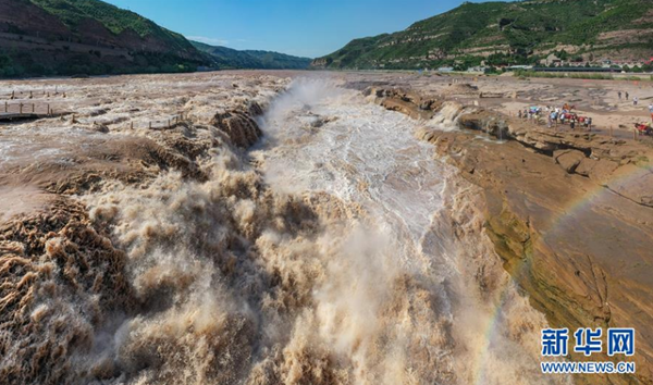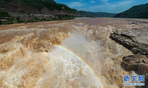 7月7日,黃河壺口瀑布主瀑上出現(xiàn)彩虹(無(wú)人機(jī)照片)。 近日,位于秦晉大峽谷的黃河壺口瀑布出現(xiàn)難得一見(jiàn)的“金色瀑布”景觀。 新華社記者 陶明 攝