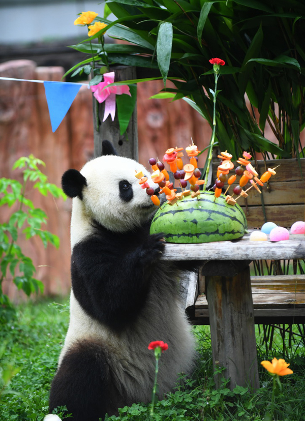 7月30日,吉林省東北虎園熊貓館為大熊貓“初心”和“牧云”舉行4周歲生日慶?;顒?,飼養(yǎng)員精心準(zhǔn)備了水果、竹子等豐盛美食,為“初心”“牧云”送上祝福。