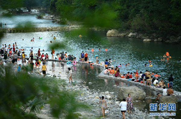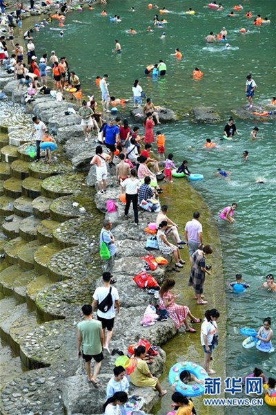 8月5日傍晚,人們在湖北省宣恩縣城貢水河游泳區(qū)內(nèi)游泳消暑。 湖北省恩施土家族苗族自治州宣恩縣在穿城而過的貢水河兩岸設(shè)立了親水步道、游泳戲水、劃船健身、休閑納涼等區(qū)域,并建設(shè)更衣室、休閑座椅、公共直飲水等基礎(chǔ)設(shè)施,方便人們共享貢水河帶來的夏日清涼。 新華社發(fā)(宋文 攝)