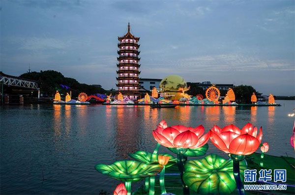 9月28日拍攝的“情意綿綿”燈組(前右)與“月滿周莊”燈組(后左)。 當(dāng)日,2020海峽兩岸(昆山)中秋燈會在江蘇昆山開幕,為期一個月。燈會設(shè)置的水鄉(xiāng)周莊燈區(qū)以水鄉(xiāng)、古鎮(zhèn)、田園江南為依托,將傳統(tǒng)彩燈與現(xiàn)代光影藝術(shù)相融合,打造“水韻芳華”夜周莊。 新華社記者 楊磊 攝
