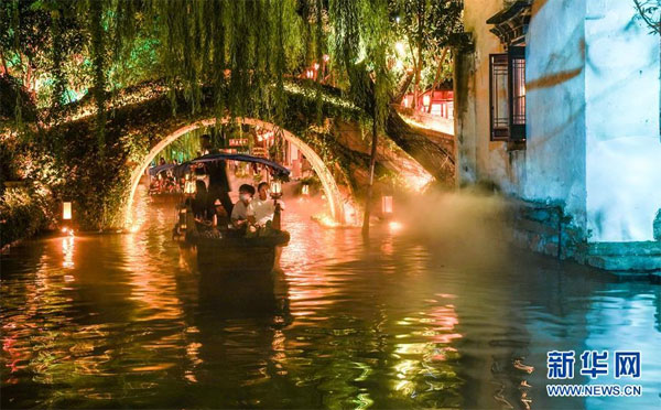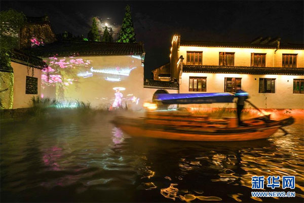 9月28日,一艘游船劃過燈光璀璨的水巷。 當(dāng)日,2020海峽兩岸(昆山)中秋燈會在江蘇昆山開幕,為期一個月。燈會設(shè)置的水鄉(xiāng)周莊燈區(qū)以水鄉(xiāng)、古鎮(zhèn)、田園江南為依托,將傳統(tǒng)彩燈與現(xiàn)代光影藝術(shù)相融合,打造“水韻芳華”夜周莊。 新華社記者 楊磊 攝