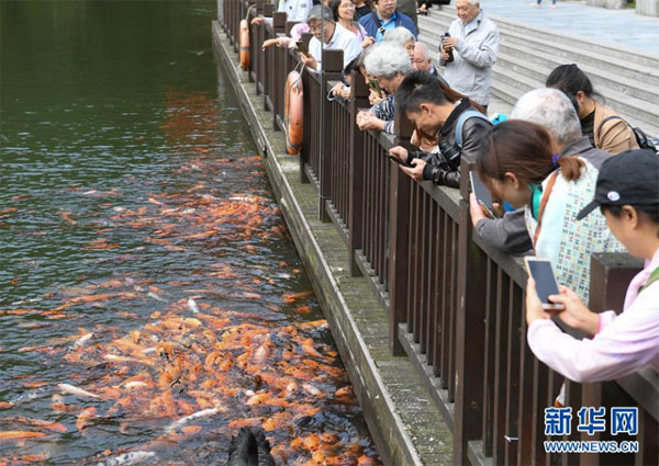 10月5日,游客在臨安區(qū)大明山景區(qū)觀魚。 中秋和國慶假期,不少游客來到浙江杭州臨安區(qū)的山間游玩,和大自然親密接觸。 新華社記者 翁忻旸 攝