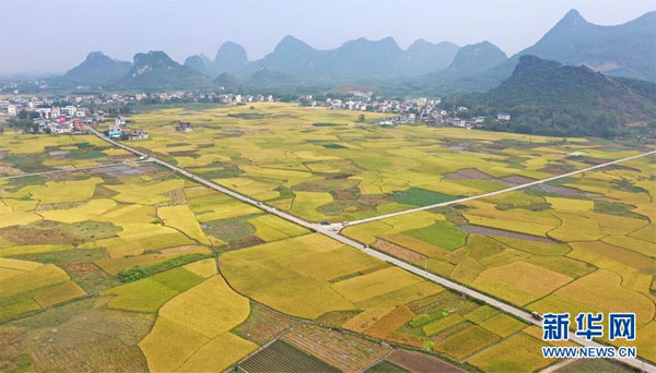11月1日拍攝的廣西柳州市柳江區(qū)進德鎮(zhèn)泗浪村的稻田(無人機照片)。新華社發(fā)(黎寒池 攝)