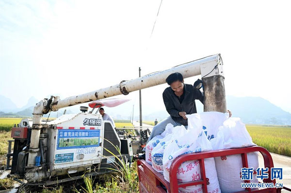 廣西柳州:深秋稻香 11月1日,在廣西柳州市柳江區(qū)進德鎮(zhèn)泗浪村,農(nóng)民在裝運剛收割的稻谷。