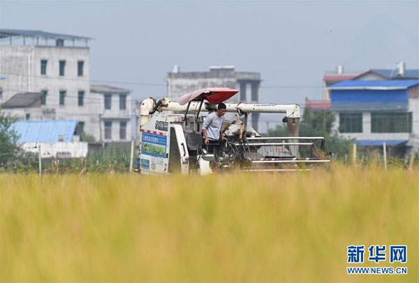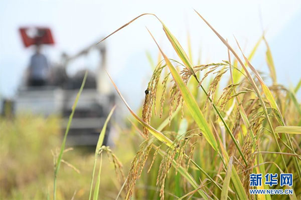 11月1日,在廣西柳州市柳江區(qū)進德鎮(zhèn)泗浪村,農(nóng)民駕駛收割機在稻田里收割晚稻。新華社發(fā)(黎寒池 攝)
