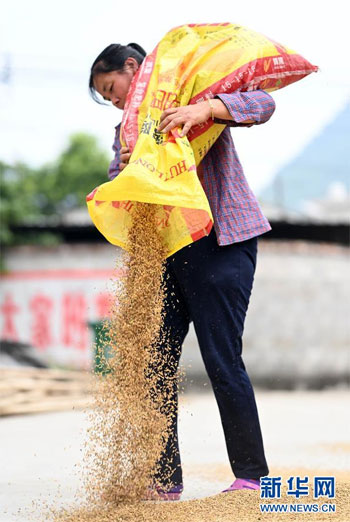 11月1日,在廣西柳州市柳江區(qū)進德鎮(zhèn)泗浪村,農(nóng)民韋鳳育晾曬剛收割的稻谷。新華社發(fā)(黎寒池 攝)