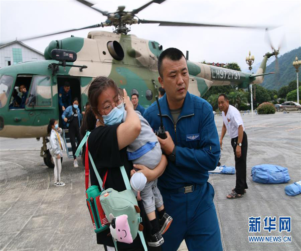 連續(xù)強(qiáng)降雨導(dǎo)致四川省綿陽(yáng)市平武縣山體滑坡,西部戰(zhàn)區(qū)陸軍第77集團(tuán)軍某陸航旅飛行員張尚年奉命轉(zhuǎn)運(yùn)災(zāi)區(qū)群眾(8月22日攝)。新華社發(fā)