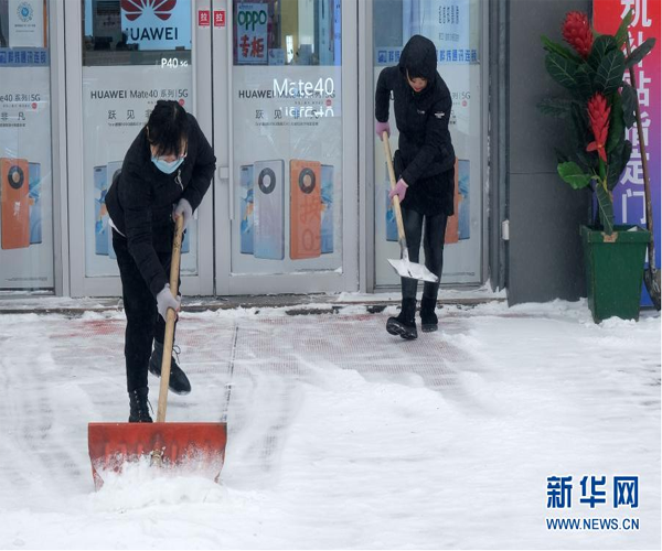 11月19日,黑龍江省牡丹江市路旁商鋪的工作人員在清理門前積雪。