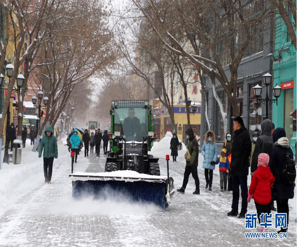 11月19日,工作人員在哈爾濱市中央大街清理路面積雪。