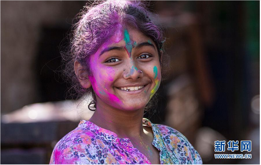 3月10日,在印度新德里,一名女孩參加灑紅節(jié)慶祝活動。