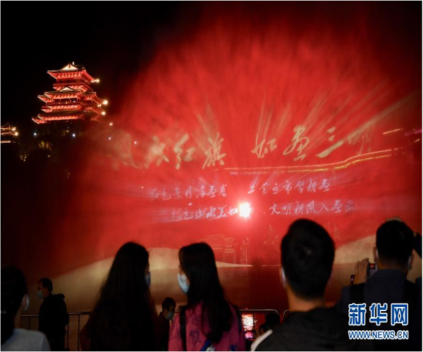 11月23日晚,市民和游客在福建沙縣沙溪河畔欣賞水幕燈光秀。