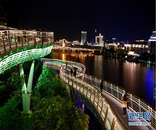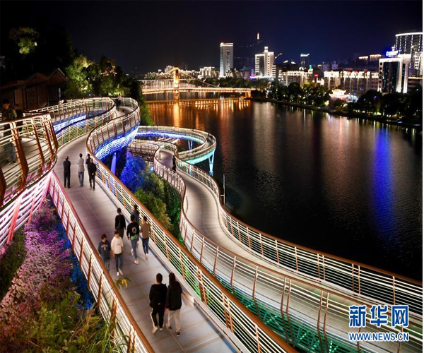 11月23日晚,市民和游客在福建沙縣虬龍橋棧道散步休閑。