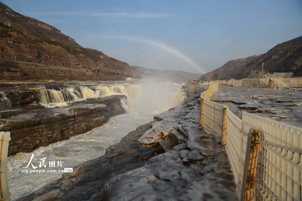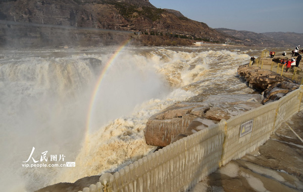 大雪時(shí)節(jié),氣溫驟降,黃河壺口瀑布飛濺的浪花和水霧在瀑布兩岸凝結(jié)形成冰掛景觀,與瀑布上空飛架的彩虹交相輝映,美不勝收,吸引了眾多游客。呂桂明 攝(人民圖片網(wǎng))
