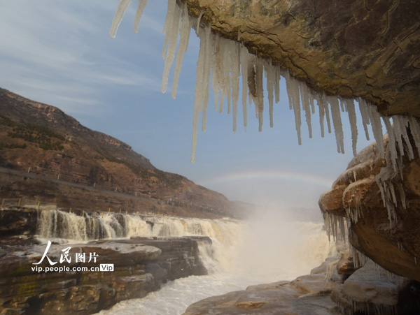 山西臨汾:壺口瀑布現(xiàn)冰掛彩虹