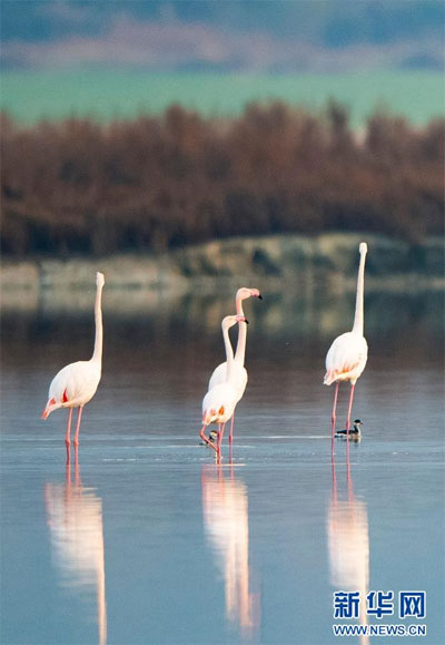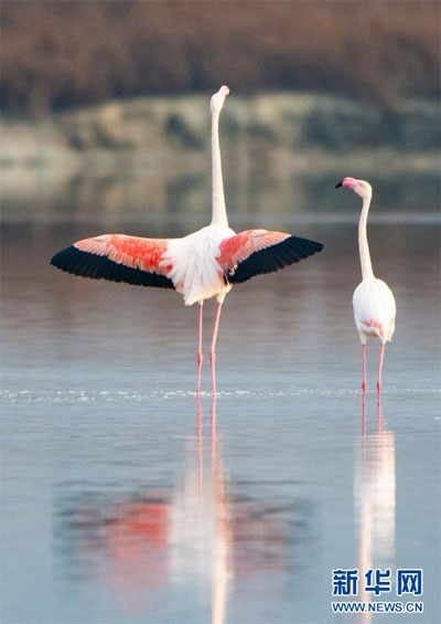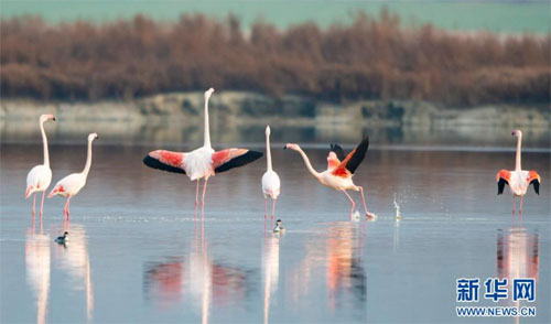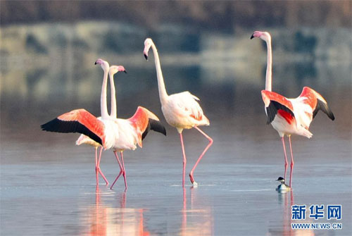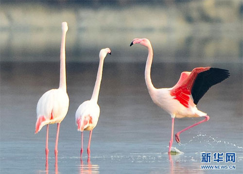隨著氣溫下降,一些火烈鳥飛抵山西運(yùn)城鹽湖,成為冬日鹽湖一道美麗的風(fēng)景。