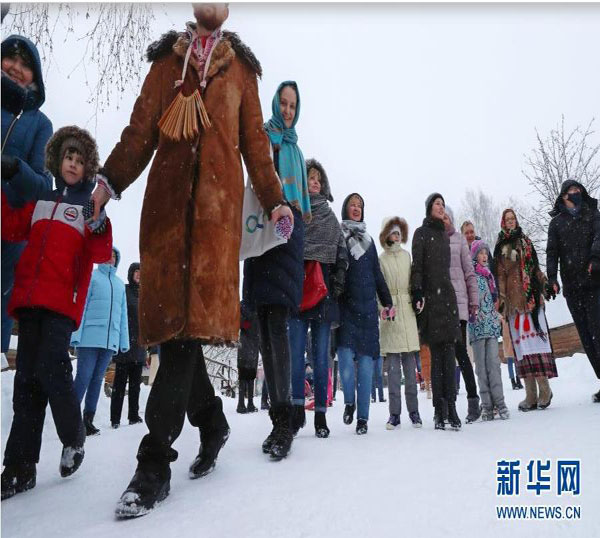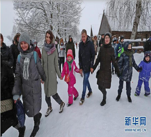 1月9日,人們?cè)诎锥砹_斯首都明斯克郊區(qū)的一處建筑博物館參加游園活動(dòng)。新華社發(fā)(任科夫 攝)