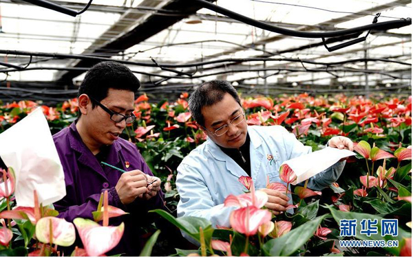 1月21日,上海鮮花港技術(shù)總監(jiān)王暉(右)給人工授粉的紅掌進(jìn)行隔離保護(hù)。 近日,上海鮮花港自主研發(fā)的兩個(gè)紅掌新品種“紅胭”“紅裝”獲得國(guó)家植物新品種授權(quán)。目前,上海鮮花港已建成紅掌品種資源圃,收集保存紅掌品種達(dá)100多個(gè)。 新華社記者 張建松 攝