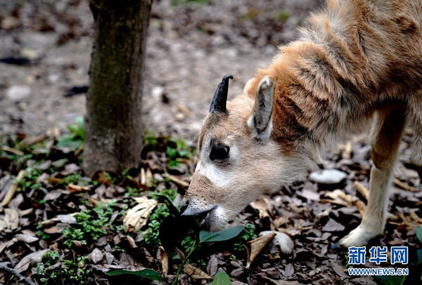 1月31日,上海動(dòng)物園“牛科寶寶”——旋角羚寶寶在覓食。