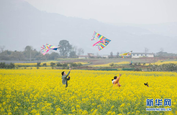 2月27日,游客在成都市金堂縣三溪鎮(zhèn)長林村油菜花田里放風箏。