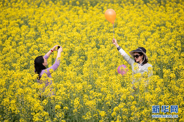 2月27日,兩名游客在成都市金堂縣三溪鎮(zhèn)長林村油菜花田里拍照。