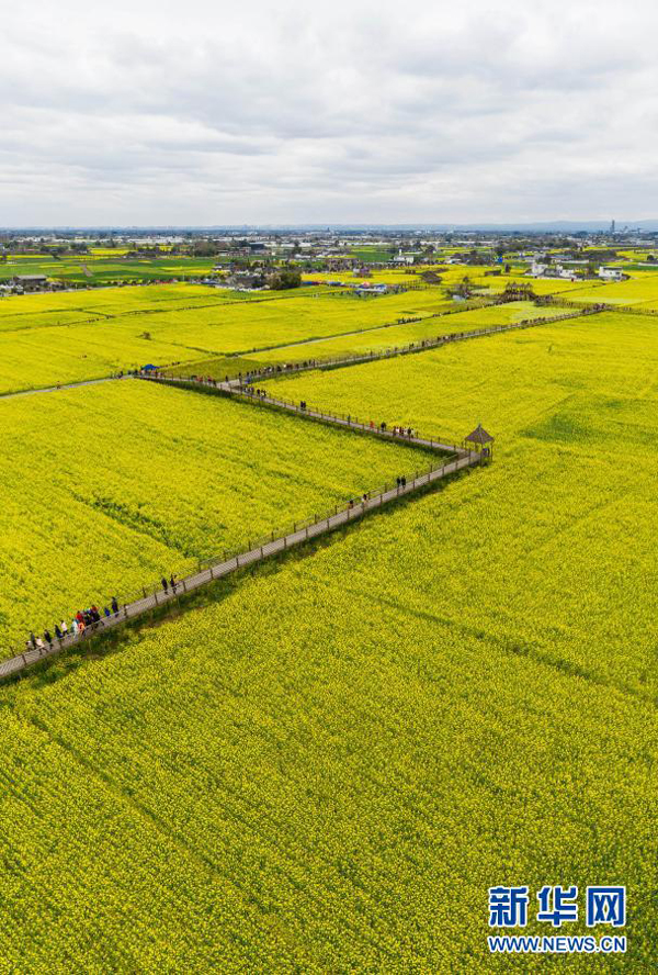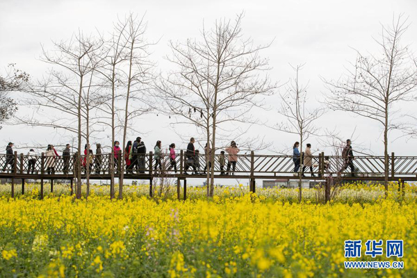 2月28日,在四川省廣漢市高坪鎮(zhèn)李堰村,游客走在木棧道上賞花。