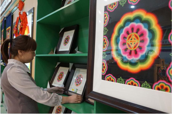 青海省海東市互助土族自治縣的土族盤繡園內(nèi)擺放的“太陽花”裝飾畫(3月5日攝)。新華社記者 央秀達珍 攝