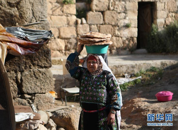 3月17日,70歲的卡茲蘭·阿布·卡巴什在約旦河西岸城市希伯倫附近的一個村莊運送制作好的“塔本”烤餅。