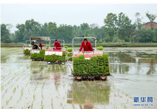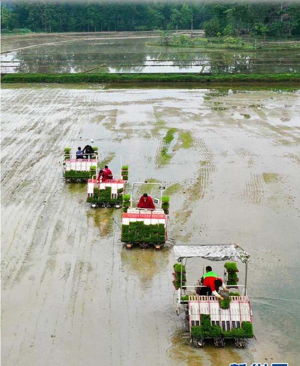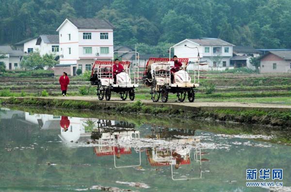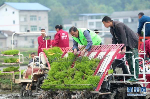 4月19日, 四川省廣安市鄰水縣一家種植合作社的社員操作插秧機栽插糯稻秧苗。