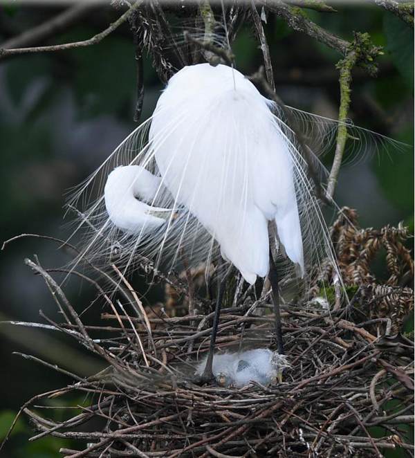 在南昌市新建區(qū)象山森林公園內(nèi),白鷺守護(hù)著雛鳥(5月18日攝)。