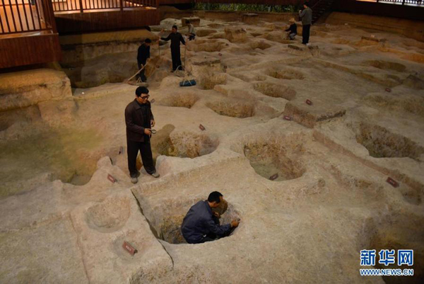 這是上山考古遺址公園發(fā)掘原址上的考古情景再現(xiàn)(5月12日攝)。