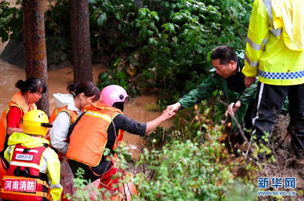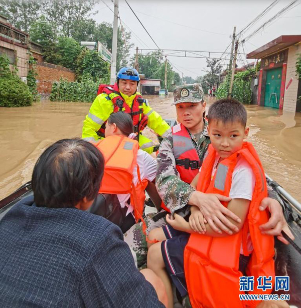 7月20日,消防救援人員在登封市唐莊鎮(zhèn)龍頭村轉(zhuǎn)移被困村民。新華社記者 郝源 攝
