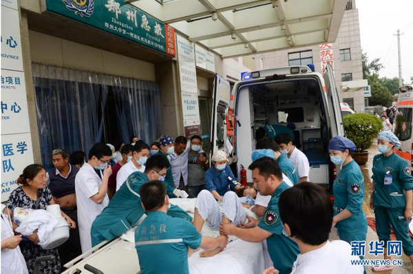 7月22日,在鄭州市中牟縣阜外華中心血管病醫(yī)院附近的錦繡路與鄭開大道交叉口,救援人員轉(zhuǎn)移病患。新華社記者 才揚 攝
