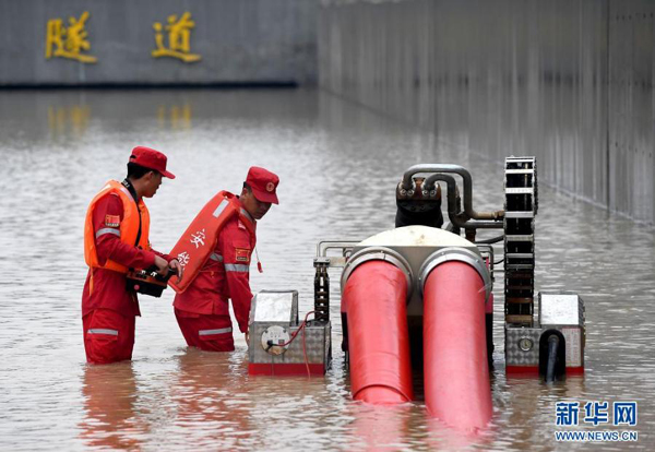 7月22日,來自江西的救援人員在鄭州市京廣南路隧道進行排澇作業(yè)。新華社記者 李安 攝