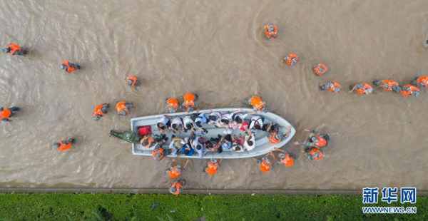 7月22日,河南新鄉(xiāng)長垣市人武部民兵乘沖鋒舟在衛(wèi)輝市牛廠村救助被洪水圍困群眾(手機拍攝)。新華社發(fā)(王升 攝)