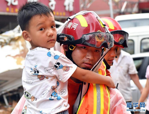 7月21日,在鞏義市米河鎮(zhèn),消防救援人員幫助群眾轉(zhuǎn)移。新華社記者 李嘉南 攝