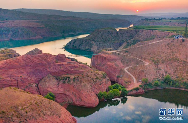 8月6日,朝霞映照下的靖邊縣龍洲鎮(zhèn)波浪谷丹霞景區(qū)(無(wú)人機(jī)照片)。